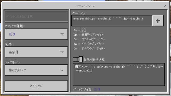 質問です マイクラpe雪玉を投げたらそこに稲妻が落ちるコマンドを使いたいんです Yahoo 知恵袋